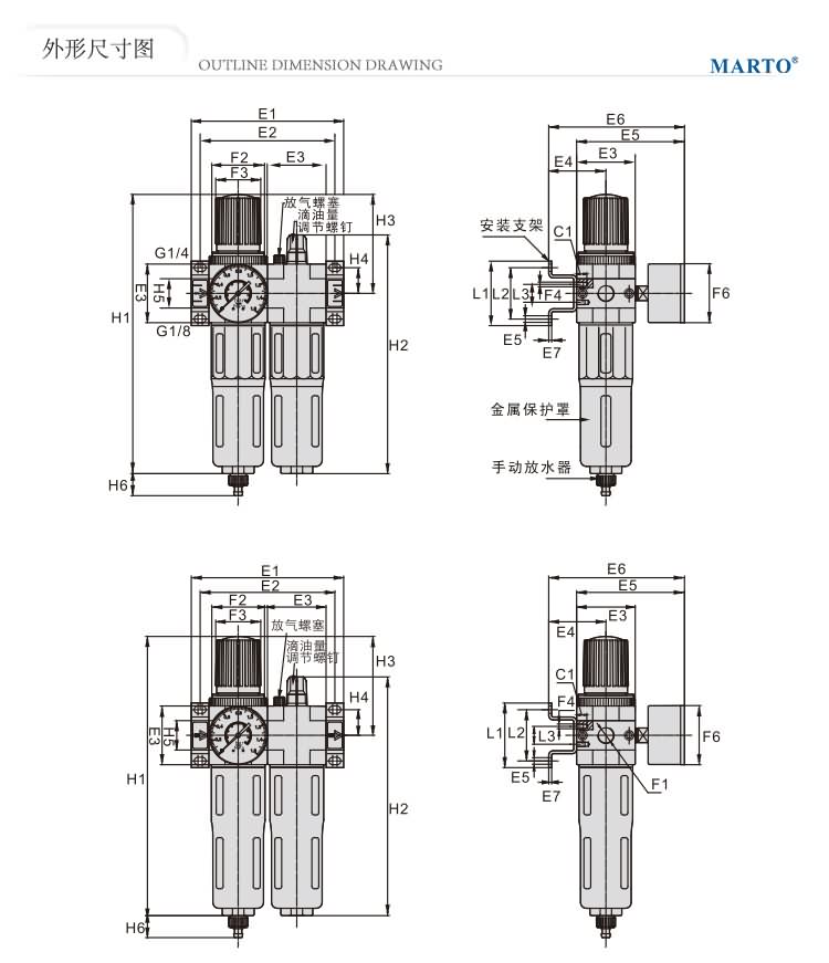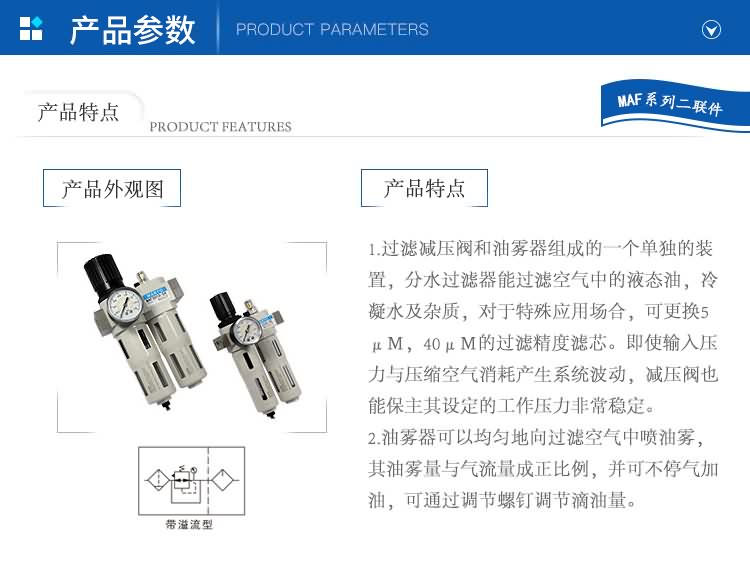 1.過濾減壓閥和油霧器組成的一個單獨的裝置,分水過濾器能過濾空氣中的液態油,冷凝水及雜質,對于特殊應用場合,可更換5μM,40μM的過濾精度濾芯。即使輸入壓力與壓縮空氣消耗產生系統波動,減壓閥也能保主其設定的工作壓力穩定。